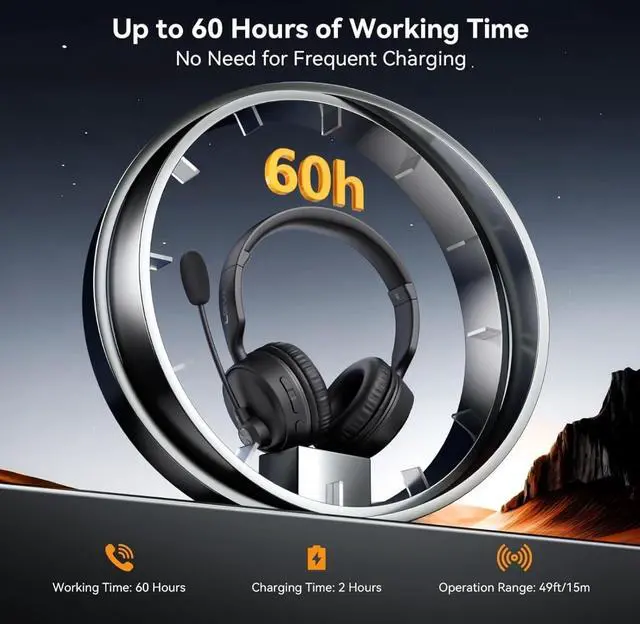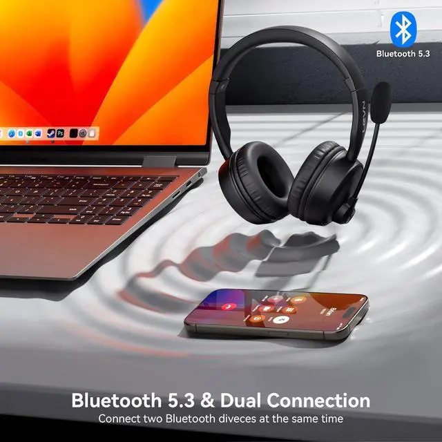 & Stable Dual Connection: LEVN Bluetooth headphones with mic features Bluetooth 5.3 and a 49 Feet range for faster pairing, a more secure and stable connection, and low latency, ensuring synchronized audio and video. Bluetooth headset supports connection to two devices, allowing you to quickly switch between video meetings and calls, ensuring you never miss an important call. These wireless headset with microphone for pc are compatible with most laptops, tablets, and smartphones ^^ 60 Hours Working Time & HiFi Stereo Sound: Say goodbye to the hassle of frequent charging. This wireless headset with mic for work fully charges in just 2 hours and boasts an impressive 60 hours of battery life. It provides 8 hours of talk time per day, allowing you to work without the risk of power outages during business trips or busy meetings. These Bluetooth headphones with microphone deliver clear stereo sound, allowing you to enjoy music in the highest wireless Bluetooth quality ^^
