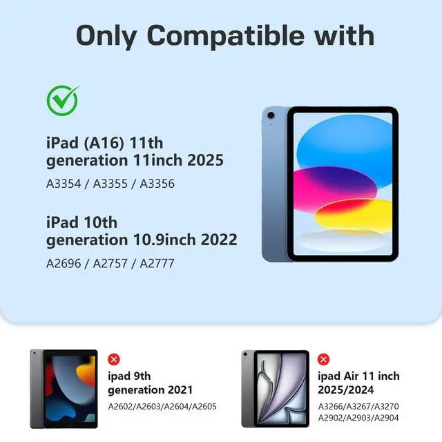 Generation 10.9 -inch 2022 (Models: A2696/A2757/A2777). Not compatible with other iPad models or devices. Please verify your iPad model number (located on the back, starting with "A") before purchasing to ensure fit. ^^ 7-Color Backlit Keyboard & Durable Keycaps This for iPad A16 case with keyboard features a 7-color backlight and 3-level brightness adjustment, perfect for typing in any light, especially late-night work or dim settings. With upgraded anti-fall keycaps design and quiet scissor-switch keys, enjoy stable, precise, and comfortable typing. Ideal for work, study, or entertainment. ^^ Long Battery Life & Fast Charge The iPad 11th/10th generation keyboard features 420mAh high-capacity battery with auto energy-saving mode that activates after 10 minutes of inactivity, ensuring extended usage. Equipped with a Type-C fast charging port, it fully charges in just 2 hours, so you never need to replace the battery. ^^ Magnetic Detachable Keyboard This keyboard case for iPad (A16) 11th/10th Gen features strong magnets, keeping the keyboard securely attached during use while allowing easy detachment. With fast, stable Bluetooth connectivity, its compatible with iPadOS, Windows, and Android, and includes handy shortcut keys and is perfect for work, travel, or casual use.