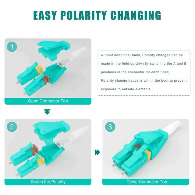 Connectors - Space-saving: LC duplex connector with uniboot is two LC connectors encased in a common housing with one boot, terminated on a single twin-fiber round cable. By using cable assemblies with LC Uniboot connectors, half of the space can be saved over traditional duplex cable. Uniboot single jacket patch cables make patch panel cable management becames considerably easier. Ideal for high-density cabling application. ^^ Reversible Polarity of Uniboot Connectors - easy polarity changing: Unlike common LC patch cords, this switchable uniboot cable supports the polarity to be switched without connector re-termination. Polarity changes can be made in the field quickly (By switching the A and B positions in the connector for each fiber), without the use of tools, to the correct fiber mapping polarity. No damage to fiber.