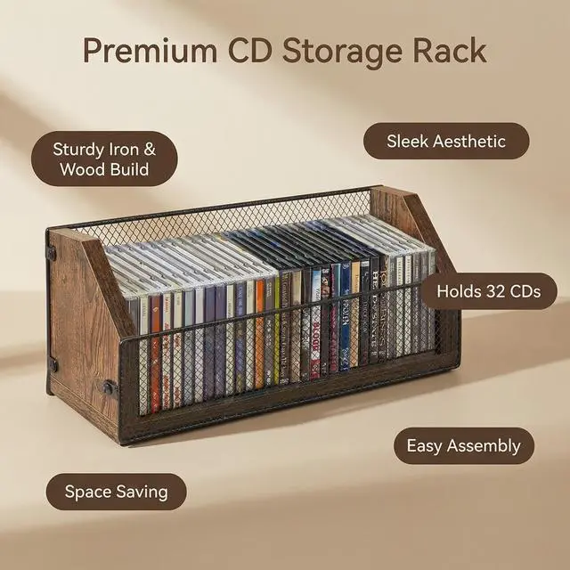 STURDY IRON-WOOD BUILD: Crafted from a durable iron frame and high-quality wood, this CD rack offers the perfect balance of stability and style. Unlike flimsy all-plastic racks, it stands firm on your desk without wobbling built to last for years ^^