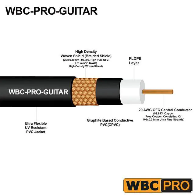 WBC-PRO-GUITAR is the Lowest Capacitance Pro-grade Graphite based instrument cable in the market & boasts an Ultra-Flexible UV-protected outer jacket, a dense braided shield (98% coverage) & a large 103 fine strands of 0.08 mm 99.99 % OFC core of 20AWG. Excellent shielding makes it suitable for even the most demanding stage/studio and cancels out all EMI & RFI, this cable encounters, resulting in the ideal tone for guitar/bass/instruments. Superior to Industry leaders like Mogami Platinum & 2524. ^^ WBC-PRO cables are designed based on science, engineered & manufactured in-house to the highest quality in the industry, and sold at prices that are unbeatable by the pro competition.