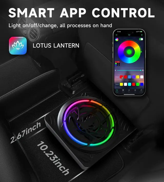 [1200W Max Booming Bass]--Feel the power of the bass in every song thanks to a racetrack car subwoofer for added depth and clarity. And with bass boom-up technology, you can tweak the bass EQ and increase the output to a staggering 1200W max ^^ [Vibe your Journey]--The Subwoofer adapts to beat-synced RGB light, the light will jump with every musical note. Add excitement to your journey with dynamic music pick up LED light, enhance the fun of the trip, and create a vibrant atmosphere. You can control the light with APP control, of course you can choose any color or turn off the light ^^ [Cast Aluminum Monster Design]--Experience stunning 1200w sound in a compact design.