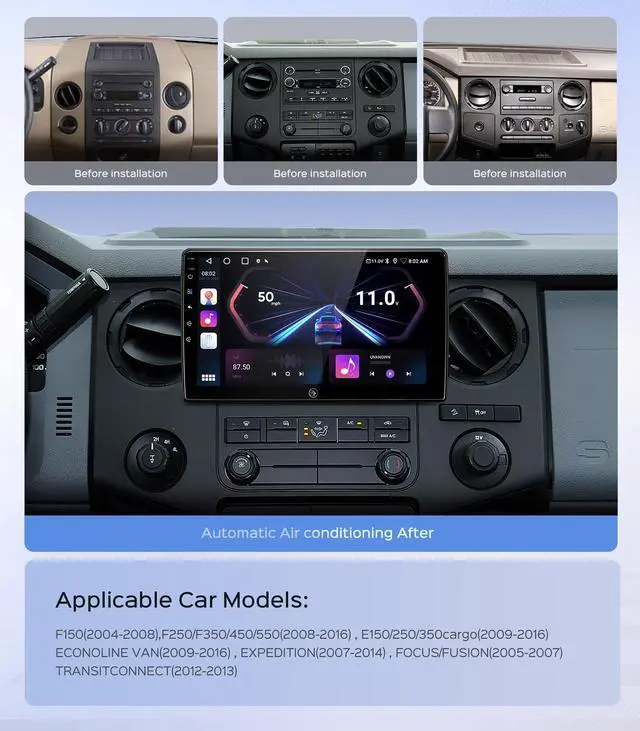 Applicable ModelsThe Ford radio is compatible with Original Factory Style Car radio For Ford F150(2004-2008)F250/F350/450/550(2008-2016)E150/250/350cargo(2009-2016)ECONOLINE VAN(2009-2016)EXPEDITION Without Navigation System (2007-2014)FOCUSFUSION(2005-2007)TRANSITCONNECT(2012-2013); Please check the year, dimensions and shape of the center console of your vehicles before purchasing. If you are not sure, you can send messages or picture to us, we will give you advice. ^^ Powerful Features & Easy UpgradeThis 10.2" Android 13 radio features 2GB RAM + 64GB ROM for smooth, lag-free performance. The IPS touchscreen delivers sharp, vibrant visuals for a better in-car experience. With a standard fit design, it installs easilyno extra parts needed.