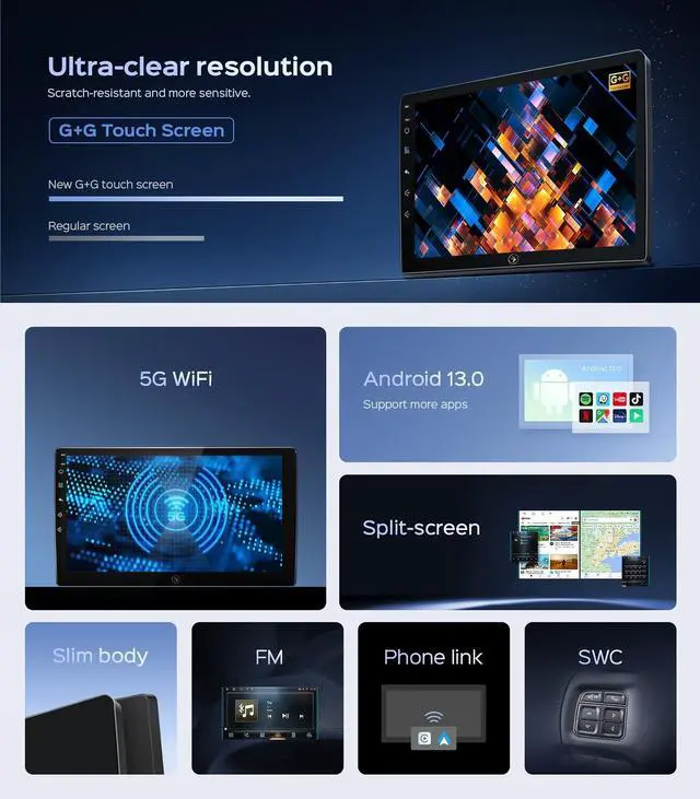 Plug and play to instantly modernize your dash. ^^ Wired/Wireless CarPlay & Android AutoThis radio for Ford offers seamless integration with your smartphone through wired or wireless CarPlay and Android Auto. This allows you to easily access your phone's apps, use Siri or Assistant for hands-free control, and enjoy features like GPS navigation, calls, messaging, music, and more, all while keeping your focus on the road. ^^ QLED HD DisplayThis car radio stereo for Ford features a high-resolution QLED 1280x720 display. Compared to standard screens, it delivers sharper, smoother images and more vibrant colors for an exceptional viewing experience.