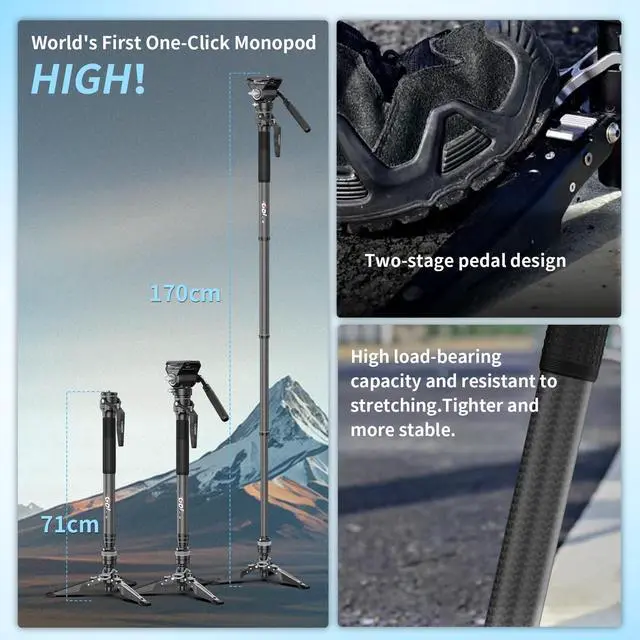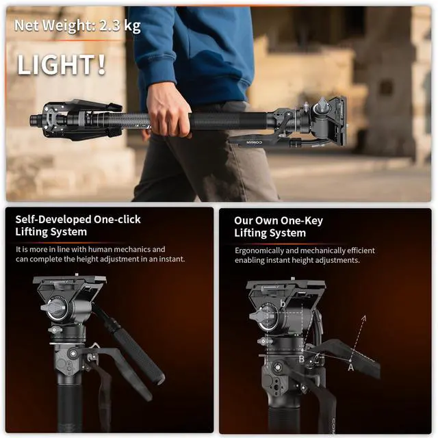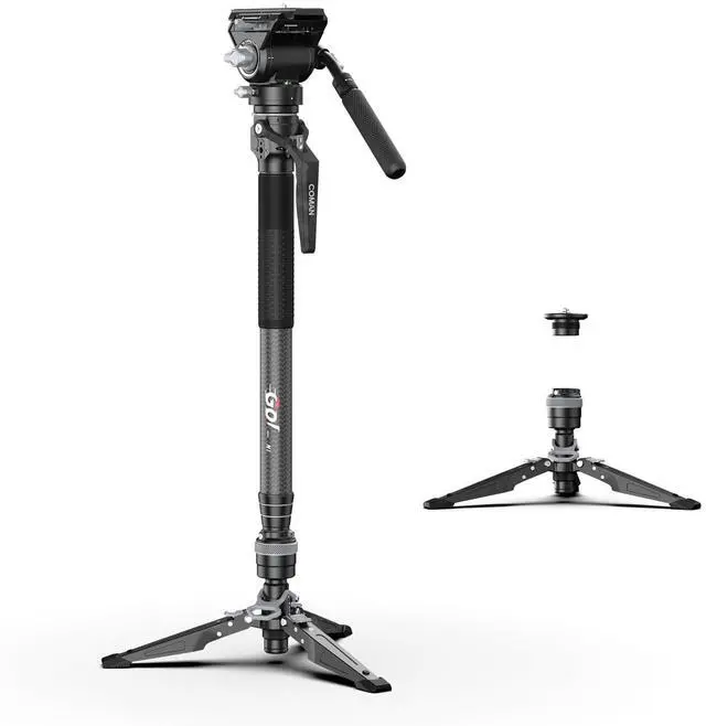 One-Click Lift & Lock COMAN M1V5 monopod equipped with one-click lifting system and an innovative four-section carbon fiber leg. The monopod for camera offers unmatched convenience in height adjustment, with just one press, extend or retract your monopod instantly, boosting setup speed by up to 300% compared to traditional designs ^^ New V5 Hydraulic Fluid Head The carbon fiber camera monopod with professional-grade V5 hydraulic head allows 90 tilt and 360 panning for precise framing. Whether you're tracking wildlife or capturing cinematic footage, enjoy fluid, stable movements with minimal effort ^^ Quick-Release Module Our M1V5 monopod for camera engineered with a quick-release modules instant transitions between ground pod and monopod mode, this feature ensures you can transition from one shooting scenario to another without wasting time, It's ideal for dynamic shooting scenarios and versatile production setups ^^ Premium B-2 Carbon Fiber TubeCrafted from high-grade B-2 carbon fiber tubes with graduated diameters (36/ 32.5 /29/ 25.5 mm), The COMAN M1 monopod delivers exceptional strength while maintaining an ultra-lightweight feelideal for demanding outdoor shoots and long hours of handheld use ^^ Enhanced Stability with Wide Support FeetM1V5 Carbon fiber monopod equipped with 190mm long support feet, the monopods maintains firm footing on uneven or slippery surfacesproviding reliable stability whether shooting in forests, mountains, or urban environments ^^ Lightweigh & PortableWith a maximum extended height of 1700mm, the carbon fiber monopod with V5 fluid head, provides ample reach for diverse shooting anglesfrom low ground to eye level.