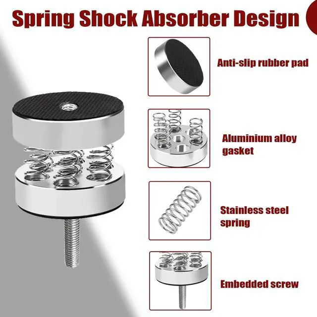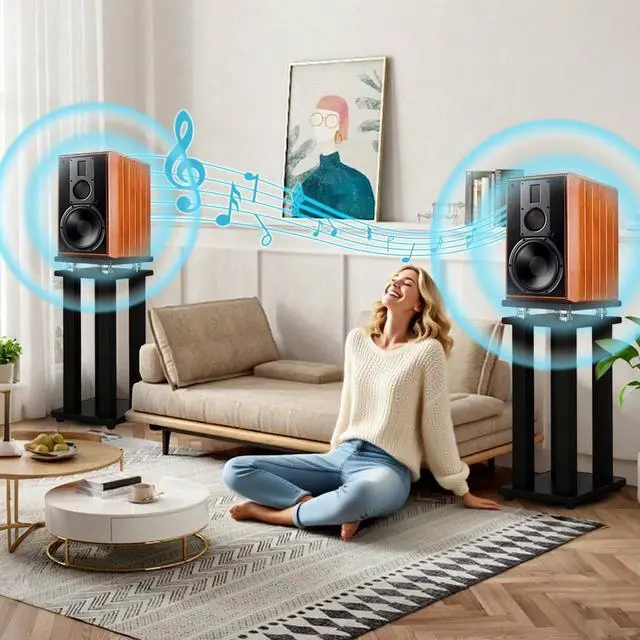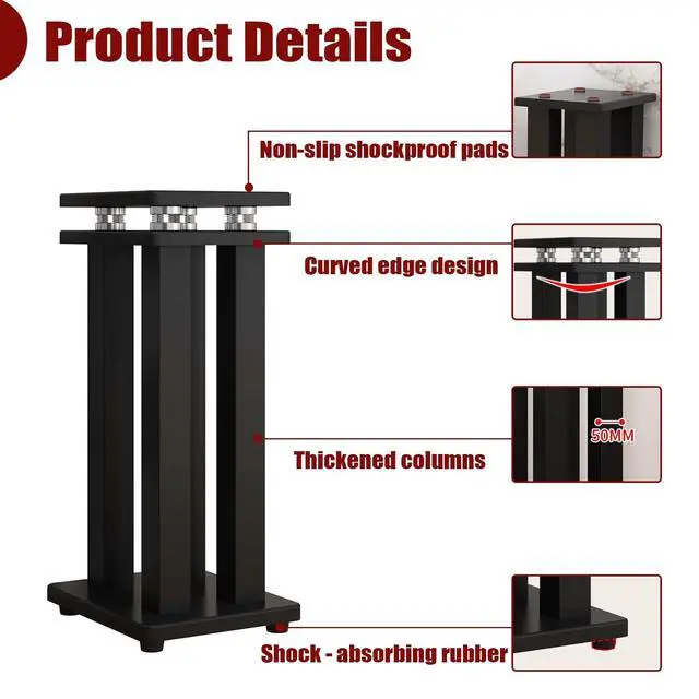 Spring DesignThe sound stands use spring design to inhibit acoustic feedback from speakers due to vibration, which can provide a more focused and lighter sound, while reducing noise, anti-vibration at the same time in order to achieve a better listening effect ^^ High Quality MaterialsThe audio stands are made of high quality material, the tray and base are made of thickened density board, thickened column support, and baked enamel on the steel tubes, which is load-bearing and sturdy for more durability ^^ Anti-slip pad designThe non-slip sticker on the bottom of the sound stand fits tightly on the contact surface and provides solid support for the sound stand.