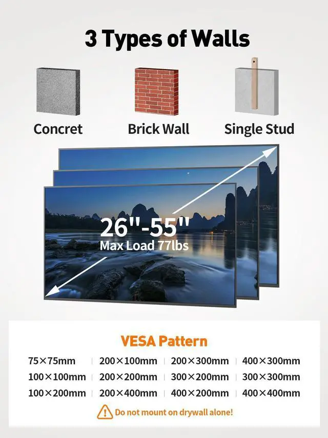 Mount Applicability: TV brands between 26 and 55 inch screen sizes and up to 77 lbs, with VESA 75x75mm 400x400mm mounting pattern fits. ^^ Dependable TV