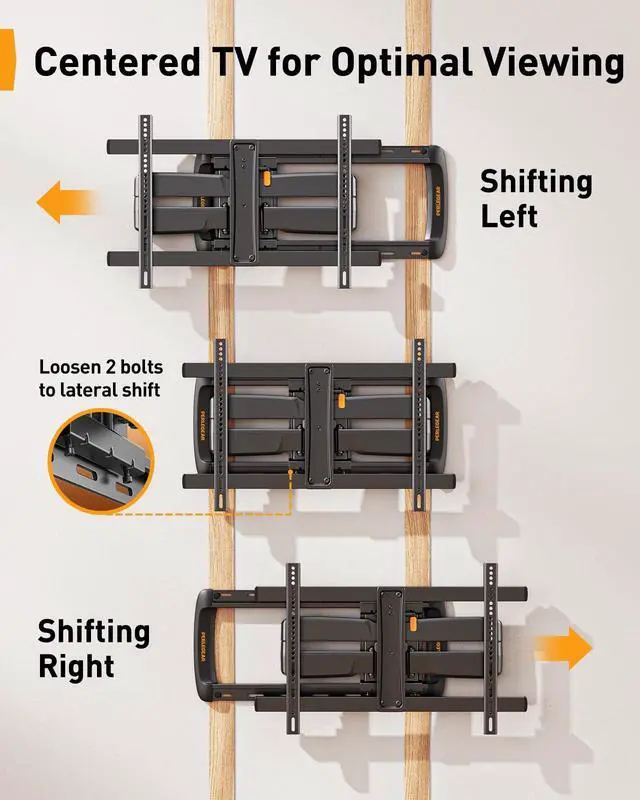 Seconds: No more worries about off-center studs! This 85 inch TV mount can be shifted horizontally to center your TV for optimal viewing with reduced neck & eye strain.
