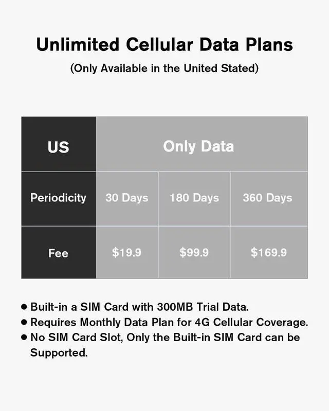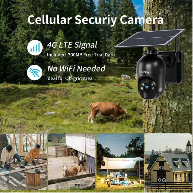 4G LTE Coverage: XEGA S20 cellular security camera wireless outdoor can work where with 4G LTE coverage, no WiFi needed. Brings a wireless experience for garden, country house and construction site. A trial SIM card inserted into the camera, This no WiF need security camera comes with an EIOTCLUB 4G LTE prepaid SIM card with 300M trial data after activation. Requires Monthly Data Plan for 4G Cellular Coverage. No SIM Card Slot. Only Support the Build-in SIM Card. 4G Unlimited Data Fees 19.9 $/month. If you have any question about this, please text to us via /Ubox. ^^ Solar Powered and
