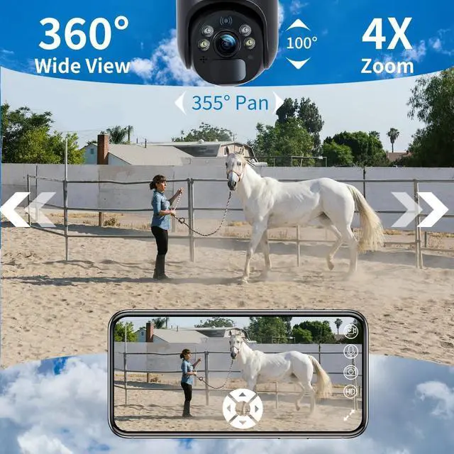 Super HD: This security camera outdoor with 4X digital zoom could pan 355and tilt 95 increases the flexibility of the solar camera to get the broad view without blind spots. Adopt color HD night vision mode could capture 2K HD colorful or non-colorful sharp footage up to 65ft. The pan-tilt feature can be remotely controlled through APP. ^^ Smart Motion Detection and