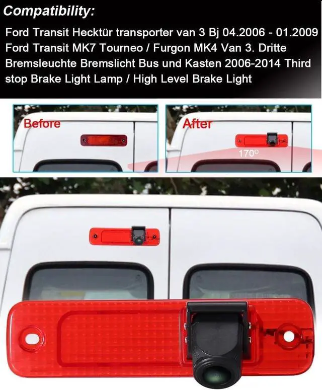 Dear customer, Please must check the camera size and appearance before place an order, see if can fit your car brake light place size and appearance! Because the same car model in different countries may have some difference, please check the camera size and compare the installation of your car carefully to avoid mistake. This product could fit for all below models as expected: Replacement for Ford Transit Transporter Van 3 BJ 04.2006 - 01.2009 Ford Transit MK7 Tourneo Furgon MK4 Van 3.
