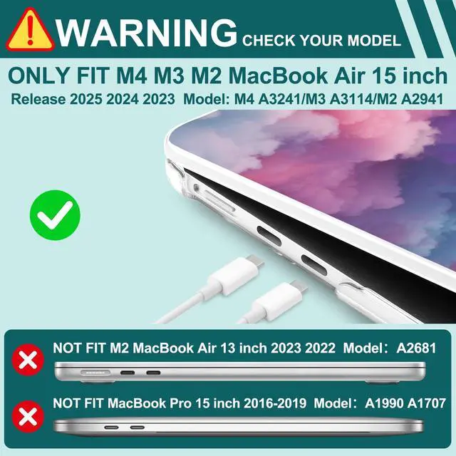 Compatible With - Only for M5/M4/M3/M2 MacBook Air 15 inch 2026 2025 2024 2023 (Only compatible model: A3448/A3241/A3114/A2941). Please confirm the model on the bottom of the MacBook before ordering ^^ Durable Material - MacBook Air 15-inch case is made of hard PC material, effective anti-slip/shockproof/anti-scratch etc ^^ Case Design - The case adopts the top and bottom case separation design, easy to install and remove ^^ Case Port Design - Precise cutouts allow full access to all ports, features, buttons, and Touch ID functionality ^^ Package - Included 1 MacBook Air 15 inch Case, 1 Keyboard Cover, 1 Trackpad Protector, 2 OTG Adapter