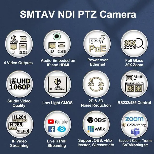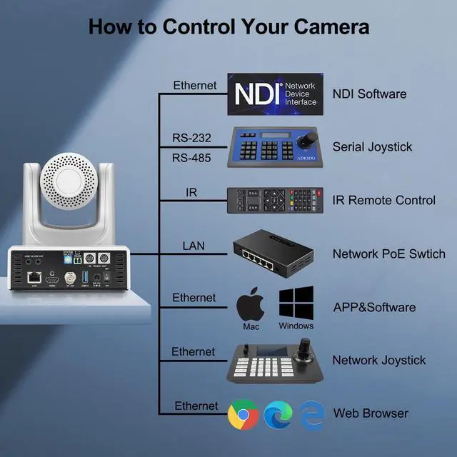 HDMI Camera is designed with rich ports to meet different usage environments, and supports 3G-SDI, HDMI, LAN, and USB output ports. Reduce the delay caused by the connection to ensure smooth and high-definition video. At the same time support live stream software. Easy and quick to complete the operation ^^ NDI PTZ Camera Spported 1080P60 FULL NDIachieved ultra high resolution and lossless image quality by network transmission. Technique of full interface and low latency -- All video output interface achieved low latency metrics. It supported transfering by 4 interfaces at the same time and 1080P60.