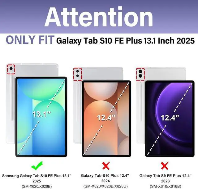 Compatibility ModelExclusively designed for Samsung Galaxy Tab S10 FE+ Plus 13.1 inch Model: SM-X620/ X626B/ X628U 2025 Release ONLY, It is not compatible with Samsung any other model device. Please kindly check before purchase.