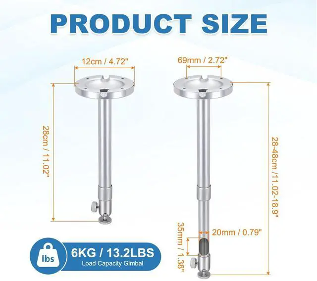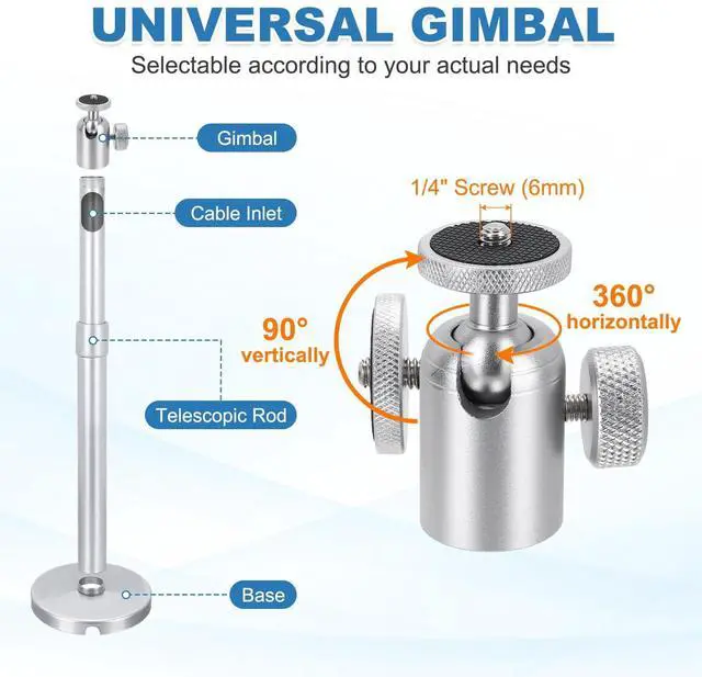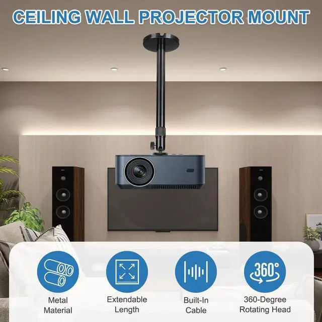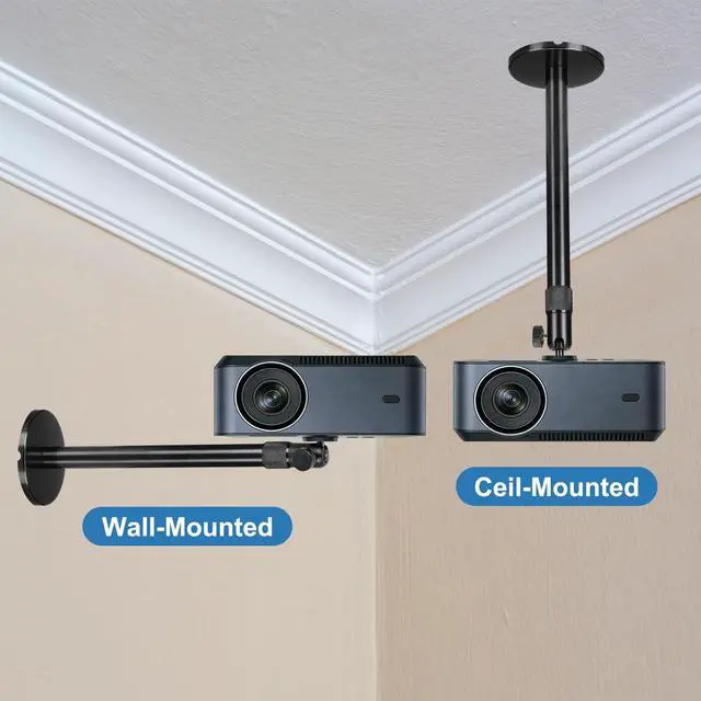 Load Capacity GimbalInstallation Method: Ceiling Mounting/Wall MountingIn the package of: 1 x Wall-Mounted Projector with Set of Mounting Hardware(Base x 1 + Cover x 1 + Gimbal x 1 + Large and Small Tube Brackets x 1 + Expansion Tubes x 4 + 3 mm Screws x 4)Are there any advantages to the product? The projector mount provides a stable and secure solution for ceiling-mounted projectors. Its adjustable length and 360-degree rotatable ball head allow for precise positioning. The design features internal cable routing for a clean, organized setup. The universal design fits most projectors with a 1/4"screw thread mounting hole, and the robust construction helps minimize shake for a steady picture. How to use it? Mount the plate to your projector, install the base on the ceiling, then connect and adjust the height and angle. Tighten all knobs to secure the position. What should I notice? Confirm your projector's mounting hole thread type (1/4 inch) and ensure its weight is within the mount's capacity before purchase. Always install into a ceiling structure that can safely support the combined weight.