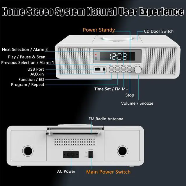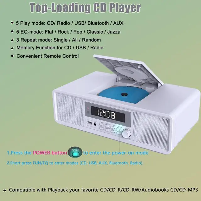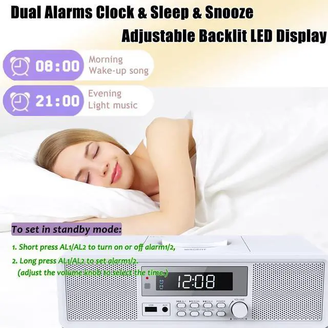 ^^ Top-Loading CD Player: compatible with Playback your favorite CD/CD-R/CD-RW/Audiobooks CD/CD-MP3, with shuffle, repeat and program functions. All in a stylish, compact and modern design that fits perfectly into any home environment. ^^ Dual Alarm & LED