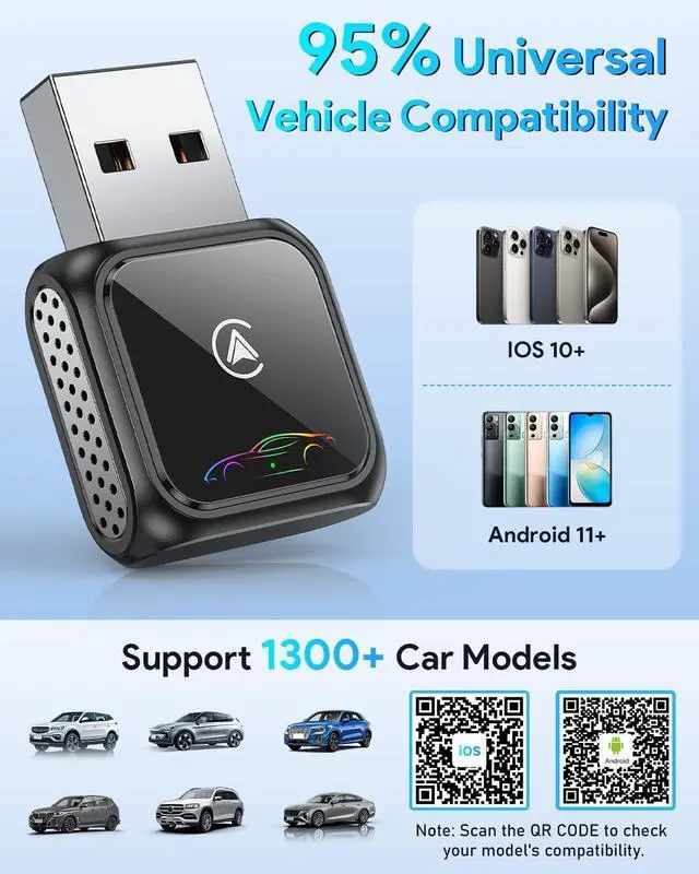 2026 Upgraded Mini Wireless CarPlay AdapterTransform factory-wired CarPlay to wireless with this ultra-compact bluetooth apple carplay adapter50% smaller than standard adapters, fitting flush in USB ports without cluttering your dashboard. Plug & play design instantly converts wired to wireless for Apple & Android CarPlay, supporting navigation, music, Siri, calls, and texts. Ideal for iPhone 6+ (iOS 10+), Android Auto and 2018+ cars, this mini usb carplay adapter blends seamlessly with your vehicles interior while eliminating tangled cables.