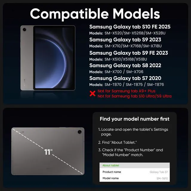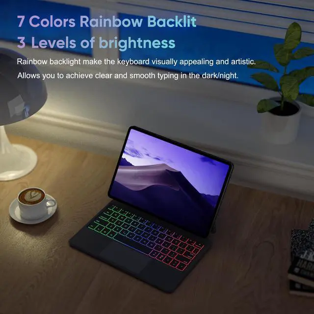 Adaptation Model- Compatible with Samsung Galaxy Tab S10 FE, S9 11 Inch 2023 (Model SM-X710/SM-X716B/SM-X718U)Tab S9 FE 10.9 inch 2023, Model: SM-X510/X516B/X518U, Tab S8 11 inch (Model SM-X700 / SM-X706) 2022 Release and Tab S7 11 inch (Model SM-T870 / SM-T875 / SM-T876) 2020 Release. Easy to carry anywhere, no matter you are in the office, at home, or on a go, transform your Samsung Tablet into a laptop within a second. ^^ Multi-Trackpad - Cursor and multi-touch gestures designed for Galaxy Tab S9/S9 FE/S8/S7. Simply put your tablet on the magnetic cover of the S9/S9 FE/S8/S7 keyboard case, and you can use the tablet like a laptop, providing a new navigation mode for your tablet, making it easy for you to edit documents or presentation pages on the tablet and Browse the web, effectively improve work and study efficiency. ^^ PU leather &Magic style - the Galaxy Tab S9/S9 FE/S8/S7 keyboard case is made of PU leather, which can effectively protect the tablet and avoid scratches on the back shell. Tab S9/S9 FE/S8/S7 Case adopts a magnetic levitation arm design, which makes your tablet seem to be suspended in the air and provides you with a more perfect viewing angle. ^^ Colorful Backlit/Scissor Keys - Using scissor keys, the Tab S9/S9 FE/S8/S7 keyboard with 7 colors backlight, 3 brightness levels are adjustable, and the keys are illuminated in a dim environment to achieve a comfortable typing experience.