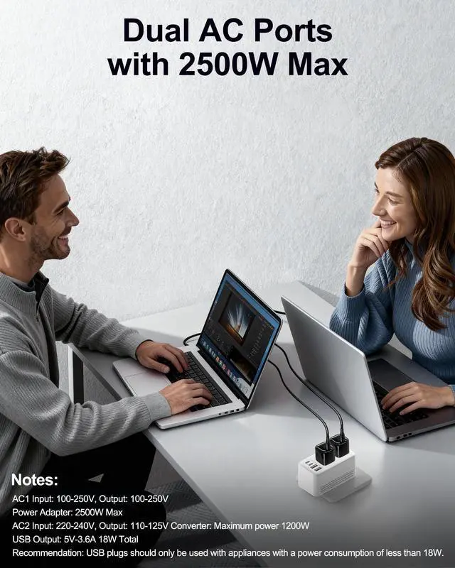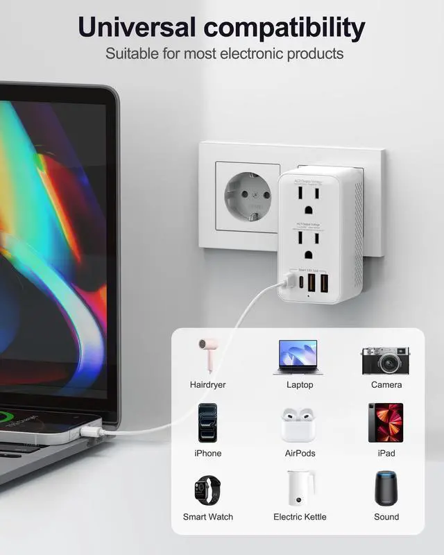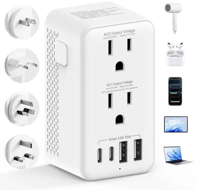 VOLTAGE CONVERTER US TO EUROPE: This International travel adapter features a step-down socket converting 220-240V to 110V for 1200W US appliances and an adaptive voltage socket for dual-voltage devices (100-240V up to 2500W), perfect for laptops and kettles abroad. ^^ HIGH-POWER SUPPORT FOR HAIR DRYERS & MORE: Designed for travelers, this International travel adapter supports up to 2000W, perfect for hair dryers, phones, cameras, tablets, and other electronics.