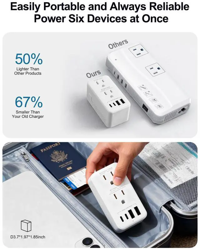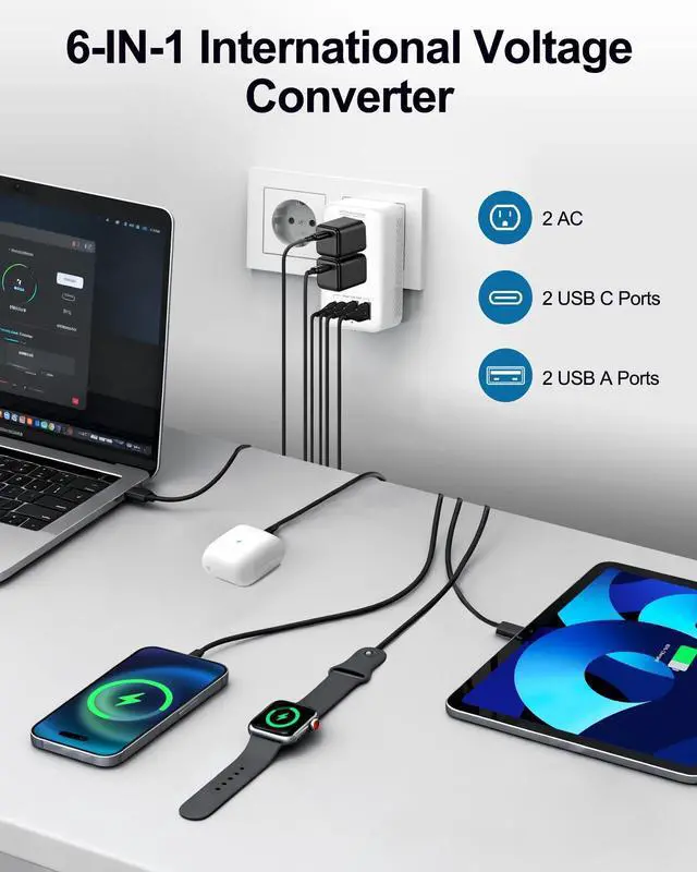 FAST CHARGING FOR MULTIPLE DEVICES: Equipped with 2 AC sockets plus 4 USB ports (2 USB-A and 2 USB C with 18W total output), this USB C travel adapter powers your phone, tablet, laptop, and other devices all at once. Charge 6 Devices Simultaneously. ^^ ULTRA-COMPACT, PORTABLE, AND