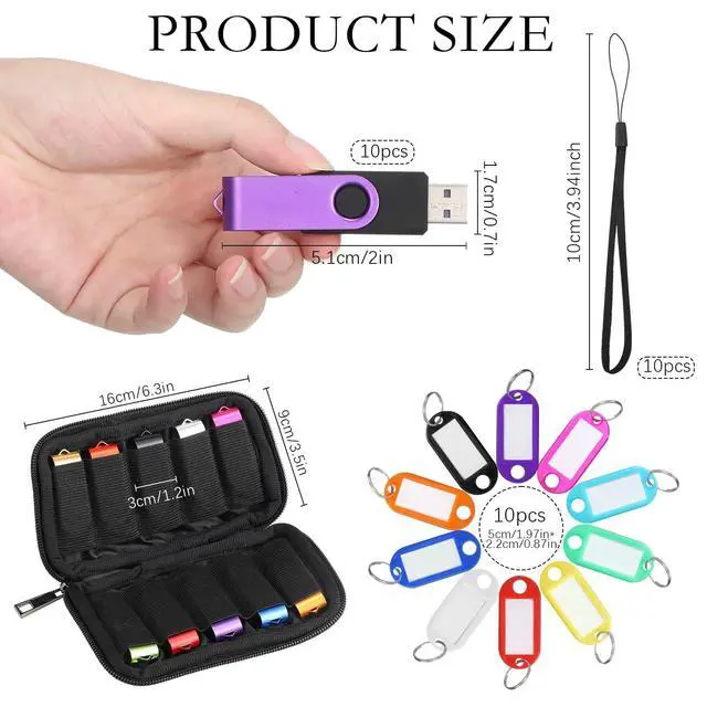 multicolorSize: about 2.28 x 0.7 inchPackage includes: 10 x Flash drives bulk with lanyards, key