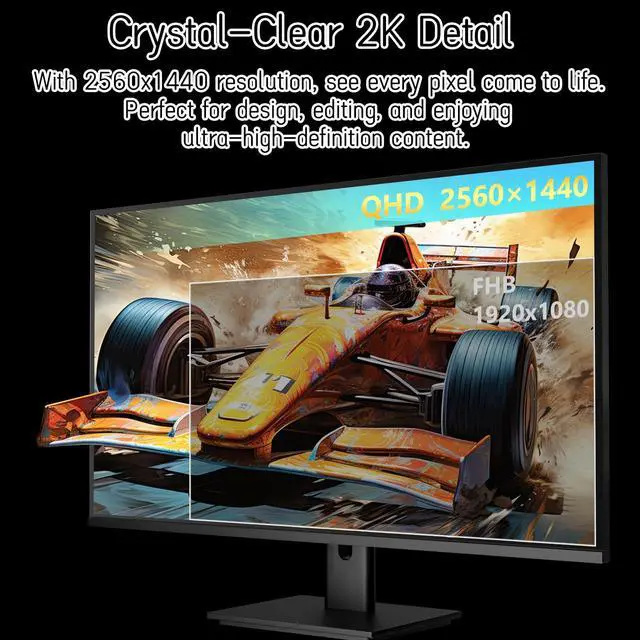 - 27 inch 2K high resolution display delivers sharp and detailed visuals for work and entertainment.