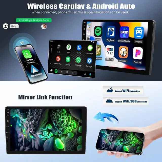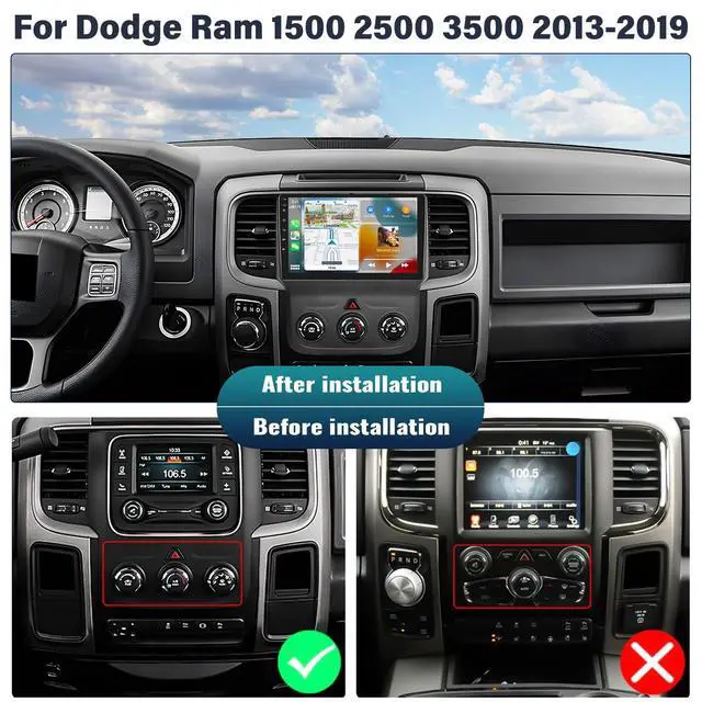 Android 13 Car StereoFits for Dodge Ram 1500 2500 3500 2013-2019. Android system Quad 4 Core and 6GB RAM + 128GB ROM ensure smooth operation and fast response. 9 inch capacitive 2.5D tempered glass touch screen, with high resolution 1280*720 IPS. Clearer picture and richer colors. ^^ Built-in Wireless Carplay & Android Auto& Mirror linkBulit in Wireless Carplay & Wired Android Auto, support to use smart voice assistant or touch the display, you can make calls, send and receive messages, and enjoy music etc. A smarter, safer and more fun way to use your phone in the car, and keep you stay focused, connected and entertained.