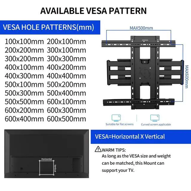 Compatibility: This TV wall mount fits most 55"-95" TVs, supports up to 132lbs, and fits Max VESA 600500mm mounting patterns ^^