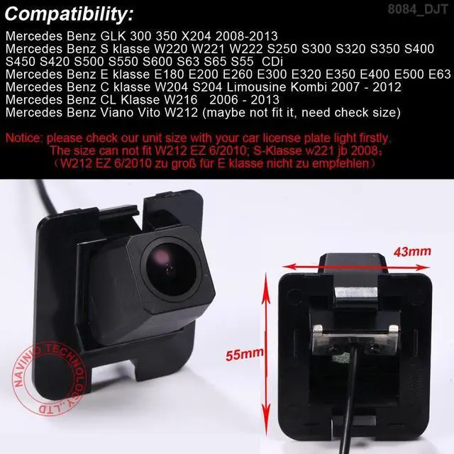 This product could fit all of the following models as expected: Replacement for Mercedes Benz GLK 300 350 X204 2008-2013; Replacement for Mercedes Benz S klasse W220 W221 W222 S250 S300 S320 S350 S400 S450 S420 S500 S550 S600 S63 S65 S55 CDi; Replacement for Mercedes Benz E klasse E180 E200 E260 E300 E320 E350 E400 E500 E63; Replacement for Mercedes Benz C klasse W204 S204 Limousine Kombi 2007-2012; Replacement for Mercedes Benz CL Klasse W216 2006-2013; Since the same car model may have differences in different countries, please check the camera size and compare your car's installation carefully to avoid mistakes.