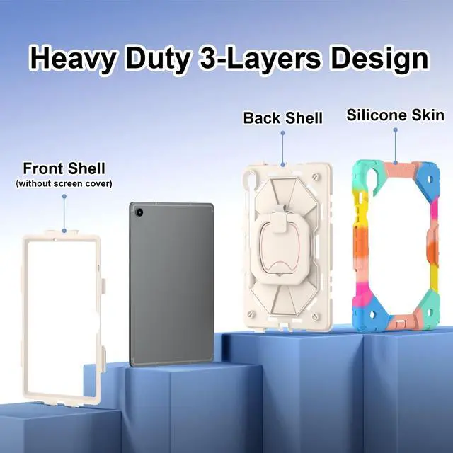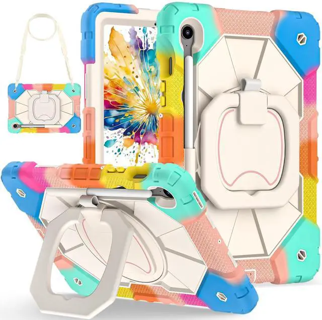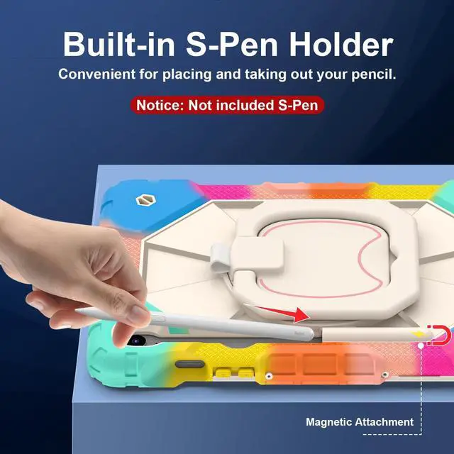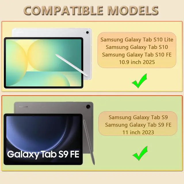 CompatibilityThe Tablet case compatible with Samsung Galaxy Tab S10 Lite /Galaxy Tab S10 FE (X520/X526B/X528U) /Galaxy Tab S10/Galaxy Tab S9 FE (X510/X516B/X518U) /Galaxy Tab S9 (X710/X716B/ X718U), Note: Not suitable for other models, Please check your tablet before making a purchase. (Go to " Settings " on your tablet - About Tablet - Model). ^^ High Quality Materials The Tablet Case is made of advanced thermoplastic polycarbonate and anti slip silicone, which is heavy-duty and sturdy, The four corners are thickened and designed, perfectly protecting your machine from damage. ^^ Adjustable Stand The prominent PC stand allows you to easily access, type, watch movies, play games, and more during your study, work, and leisure travels. Flexible expansion and contraction, without taking up space. ^^ Built in Pen HolderBuilt in Apple Pencil slot, convenient for placing and removing pencils, no longer worrying about loss or damage. Always keep Apple Pencil as secure as iPad (only protective case, not Pencil included! ) ^^ Multi Functional Shoulder StrapComes with a detachable and adjustable shoulder strap, both children and adults can carry the tablet case with them, especially suitable for travel. You can hang it behind your seat like a TV while driving.