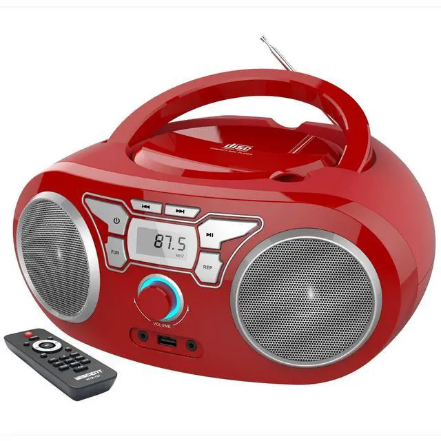CD Player Boombox: Top-loading CD player compatible with CDs, CD-R/RW, CD-G, audiobooks and MP3/WMA discs. with shuffle, resume, and repeat (1/all) functions.