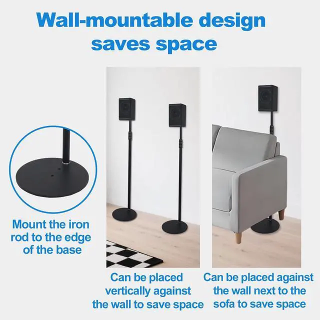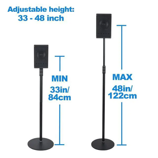 DAGCUXIN speaker stands base is made of heavy-duty steel plate with a thickness of 6 mm, providing more stable support. Each speaker stand can bear a weight of 6 pounds. ^^ Speaker stand of the extendable tube is adjustable from 33" to 48" to ensure perfect and customized sound. Bookshelf speaker stands can adjust the post assembly for puts sounds at ear level. ^^ The base plate has three hole positions to choose from, allowing you to place the bracket behind the sofa or TV cabinet. ^^ Speaker stands pair includes all the required hardware so you can easy to install it.