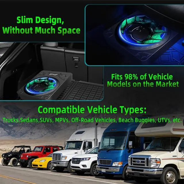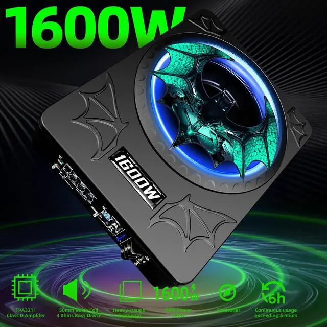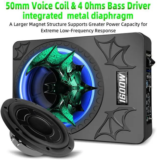 Filter (LPF: 50-150Hz), input gain, and bass boost (0-12dB @ 45Hz) functions. Equipped with a 50mm voice coil and 4-ohm bass unit, it enables precise sound tuning based on music styles and personal preferenceswhether you pursue delicate low-frequency layering or shocking loud bass, you can easily create an exclusive audio feast. ^^ Physical Switch LED Ambient Lights, Dynamic Atmosphere at Your Fingertips Built-in colorful LED ambient lights with a convenient physical switch, no cumbersome APP control required, avoiding power waste from accidental light activation. The lights flash synchronously with the music rhythm, creating a personalized dynamic in-car atmosphere that combines visual appeal and driving pleasure. The one-click on/off design is simple and easy to use, balancing energy-saving needs and daily convenience, adding more vitality to the cabin ^^ Intelligent Heat Dissipation & Multi-Protection, Stable, Durable & Reliable Scientific exterior design combined with a built-in intelligent heat dissipation system ensures no overheating risk during long-term high-power operation, guaranteeing stable output. Equipped with triple protection mechanisms (short circuit, overload, and overheating protection), it fully avoids usage risks, effectively protects the subwoofer from damage, and extends its service life.