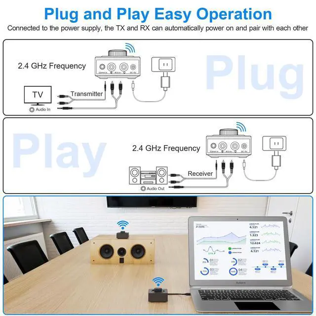 ^^ [Dual AUX/RCA In/Out] Comes with 3.5 mm plug to RCA adapter cable, the audio receiver support simoutaneous AUX/ RCA output for 2 speakers. Connect the transmitter with PC, TV, CD, MP4 output, and connect the receiver with powered speaker, amplifier or home theater, plug and play, easy operation for true wireless audio transmission.: Dual AUX and RCA input at the same time is not recommendas the audio would be mixed up at the receivering end. ^^ [25ms Low Latency Auido Transmission] Designed with anti-interference technology, the transmission distance can reach up to 200Ft(60m, no obstacle) and minimum 98Ft (30m) for indoor use, enjoy lower than 25ms lantency low noise audio.,. ^^ [ 2.4GH z Hi-Fi Audio Enjoyment] The audio adapter kit features 2.4GH z true wireless connection, no more cords, freely enjoy high fidelity music. Very suitable for home TV, PC, MP4 office audio speaker connection, get rid of distance limitation and enjoy high quality stereo streaming audio at every corner of your home.