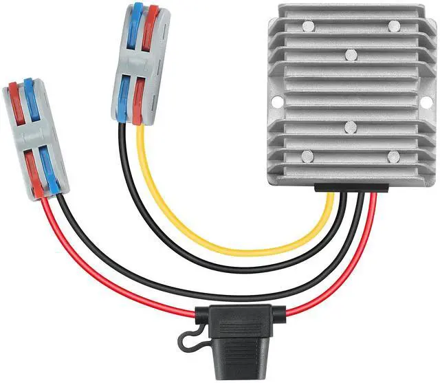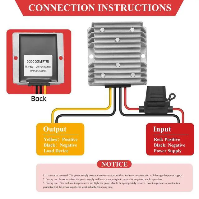 Step Down Converter: Input parameterInput range 20-90VRated input voltage24/48/60/72/84VTransfer efficiency95%Incoming line15-16CM(R+ B-)Output voltage12VOutput20A MAXMaximumoutput240W MAXNo-load adjustment rate2%Load regulation3%Quiescent dissipation30MARipple wave300mVP-PThe oscilloscope bandwidth is 20 MHz, and the test end is connected with 10 F electrolytic capacitor and 0.1 F ceramic capacitor. Outlet line15-16CM(Y+ B-))Enviromental ParameterWorking temperature-20-65Storage temperature-40-85Working humidity10%-90%RHDefencive FunctionClassification of waterproofIP67OtherWeight 0.62 lbSize 2.91 * 2.91 * 1.26 inchHeat dissipation methodnatural heat dissipationMatters need Attention1. The products are stored in a dry and cool place with a temperature range of-40 ~80, and avoid contact with corrosive substances, and stay away from fire and heat sources. 2. Do not use it near a heat source (such as a fire or a heater). 3. Do not connect the input line to 220V electricity. 4. Do not put the product into the fire or heat it. 5. Do not short-circuit the positive or negative poles of the product with wires or other metal objects. 6. Non-professional personnel are prohibited to disassemble and repair by themselves. Packaging content1x DC 20-90V to 12V 20A 240W Buck Converter