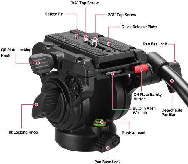 2-Section Pan Bar Detachable handle can be installed on the left or right side according to your needs and the safety lock protects your camera from accidents at all times. ^^ Made of all-metal precision CNC and casting technologies, the fluid head is firm and stable, rotates smoothly. Its maximum load is 11 lbs/5 kg while net weight is 1.9 lbs/ 0.86 kg only. ^^ The fluid damping tripod head with the 1/4" and 3/8" screws on the top can be used to mount the camera and telescope. Bottom base diameter 2.36 in/60 mm, Standard 3/8" screw hole on the bottom (included with a 3/8 inches to 1/4 inch screw adapter) makes it suitable for all tripods, monopods, light stands and camera sliders.