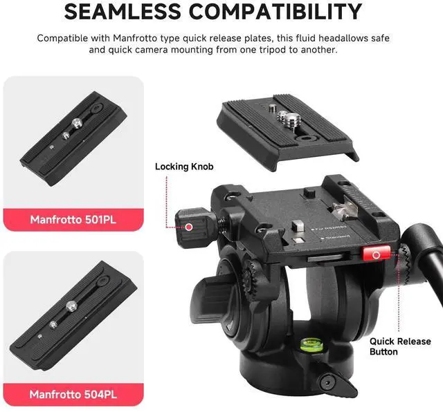 PLEASE NOTE: Compatible with Manfrotto 501HDV release platesThe video fluid head can be rotated 360 degrees smoothly on horizontal, the tilt range is -50to +90and the lock is firm, so that you can take photos whatever you want. ^^ Limited 5-Year Warranty ^^ 24-Hour
