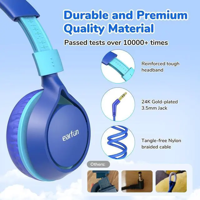 85dB Safe Volume Limit. EarFun S1 kids headphones are specially designed for kids, the volume is limited to a safe sound level of 85dB to protect children's hearing. This effectively reduces loudness while still allowing every sound detail to be heard clearly. ^^ Kids-friendly Materials & Comfort Fit. Certified with CPC safety standards and constructed from kids-friendly materials, the wired kids headphones feature soft yet sturdy earcaps, and 9-level adjustable headbands can fit different head shapes, providing a comfortable experience for all-day wearing. ^^ HD Stereo Sound. Equipped with high-quality 40mm drivers and professional EarFun sound tuning, EarFun Kids Headphones deliver distortion-free sound.