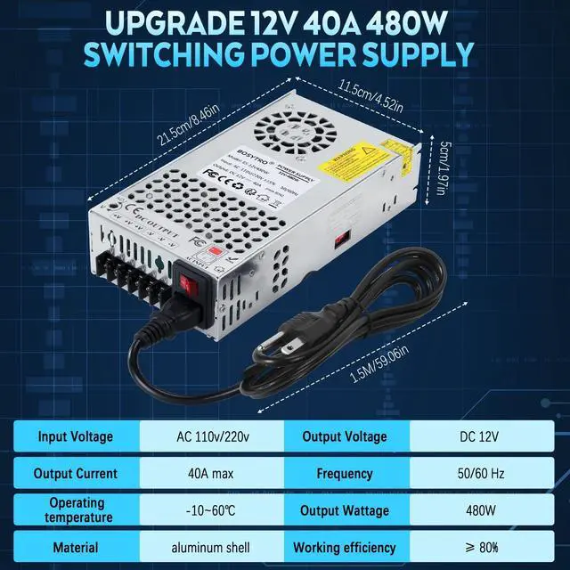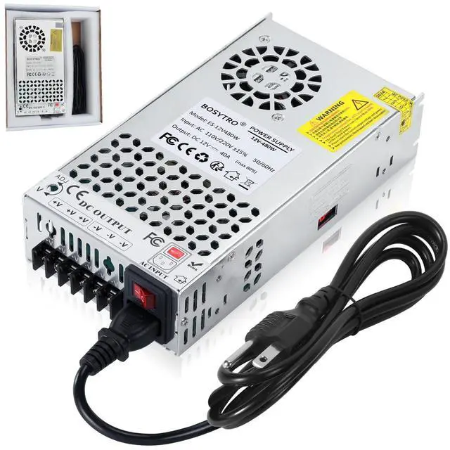 range: 10%; Output current Mainly depends on your decive, such as DC 10A/120W, 20A/240W, 40A/480W, max current up to 40A, max output power 480W, For more efficient and secure use, recommended for equipment below 384w ^^ Intelligent Cooling SystemThe 12v 480w power supply with aluminum alloy shell and designed with multiple holes for better heat dissipation, Built-in intelligent Cooling Fan to prevent overheating and burning of circuit boards, when the working temperature is more than 122 (45), the power supply will automatically run to dissipate ^^ Multiple ProtectionBOSYTRO switching power supply features a overload protection, over-current protection, over-temperature protection, short circuit protection which can protect your device from damage. Safe and stable working, suitable for newer and experienced electrician ^^ Wide ApplicationThis 12v power supply widely used in industrial equipment, RV, radio/car stereos, led strip, cctv, computer project, 3d printer, motor pump(for Motor device, the peak power of the SMPS needs to be more than 2 times the power of the Motor), security camera, lcd monitor, lab computer and more 12 volt device
