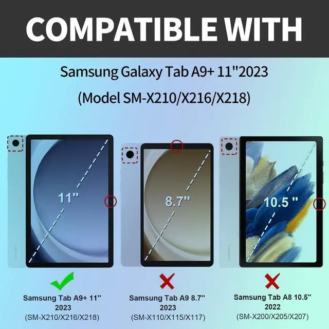 CompatibilityDesigned exclusively for Samsung Galaxy Tab A9 Plus 11 Inch 2024 2023 (SM-X210/X216/X218). Please double check the model number before purchasing. ^^ 360 Degree Rotating Made of sturdy PC frame and durable PU leather exterior, Slim/light design, case for flexible horizontal and vertical viewing. Two anti-slip grooves support 3 flexible viewing positions (2 landscape, 1 portrait). ^^ Auto Wake / SleepThis 360 Degree Rotating Tablet Cover instantly wakes up when opened, Simply operate and protect battery to extended standby time, Save battery life! ^^ Comprehensive ProtectionThis Galaxy Tab A9+ case is made of microfiber interior that protects your tablet from scratches and damage to maximize your tablet's protection from drops and scratches.