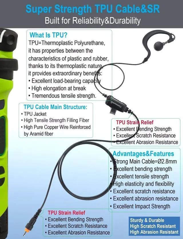 Shape EarhookFeatures: -Classic and Comfortable G Shape Earhook Made of High Quality Thermoplastic Elastomer-Earbud rod is rotatable to fit right or left ear and adjustable vertically to fit different size of ears-TPU Cable Reinforced by Aramid Fiber Bring Excellent Bending Strength, Tensile Strength, Scratch Resistance and Abrasion Resistance-Rugged Lapel Microphone with Stainless Stell Swivel Clip and High-Feedback PTT SwitchCompatible with