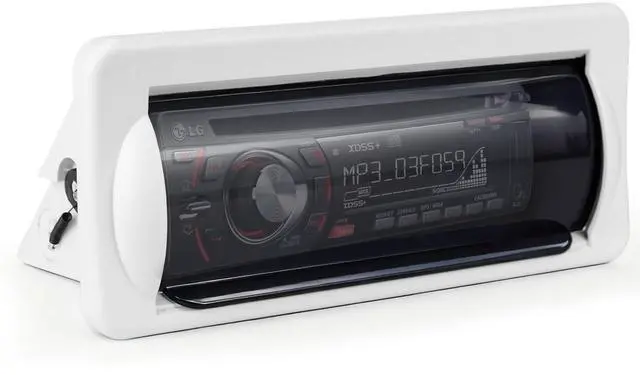 Water-Resistant ProtectionShields your marine radio from wind and saltwater spray. This cover creates a reliable seal for your marine stereo, helping prevent damage from harsh environmental conditions. ^^ Easy Access DesignComes with a flip-up door and simple spring-activated release for hassle-free use. Switching channels or adjusting volume is straightforwardyou can use the head units remote or open the cover to make adjustments. ^^ Smoke-Colored HousingThis durable marine stereo cover features a tinted front panel that lets you see controls clearly. Its UV-resistant housing also helps prevent overheating. ^^ Built-In Radio Support ShelfKeeps your marine stereo or CD player securely in place, even during intense boat movements.