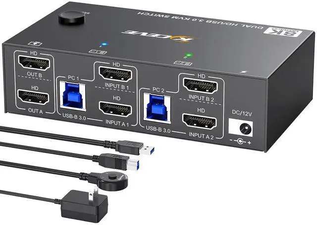 Note: Actual resolution depends on your graphics card, monitors and cables. ^^ 2 Monitor KVM Switch with 4 USB 3.0 Ports 8K HDMI KVM Switch integrated 4 USB 3.0 ports for keyboard, mouse, printer & USB drives supports 5Gbps ultra-high-speed data transfer (10x faster than USB 2.0 ). Ideal for multi-device workflow. ^^ Great compatibility & 2 switching modesKVM switch 2 computers 2 monitors driver-free for Windows, Mac, Linux, Unix and Ubuntu. Support Laptops and desktops. it is widely applied for home, Office, etc. You can press the button on the panel or use the wired remote (included) to switch the 2 computers. Two color LED indicate the active computer. ^^ You Will Get1* Dual monitor KVM switch, 2* USB 3.0 cable, Wired remote, 12V power adapter and User manual. ANGEET provide 1 year wa-r-ranty. This 2 monitors KVM switch is a HDMI KVM switch, NOT a Displayport KVM switch, Please ensure that your computer graphics card has at least 2 HDMI ports.