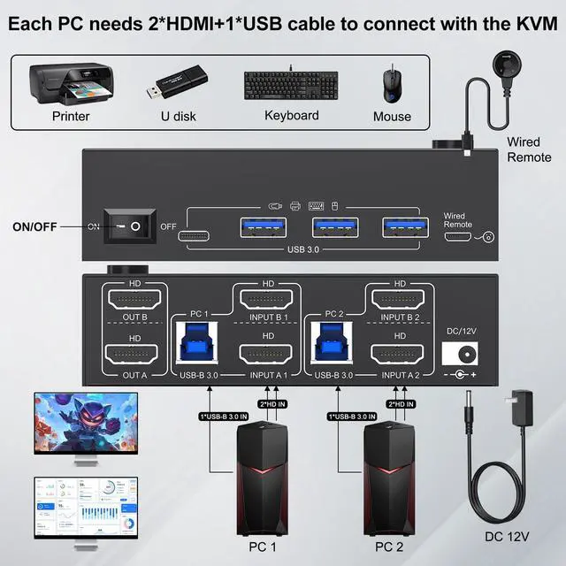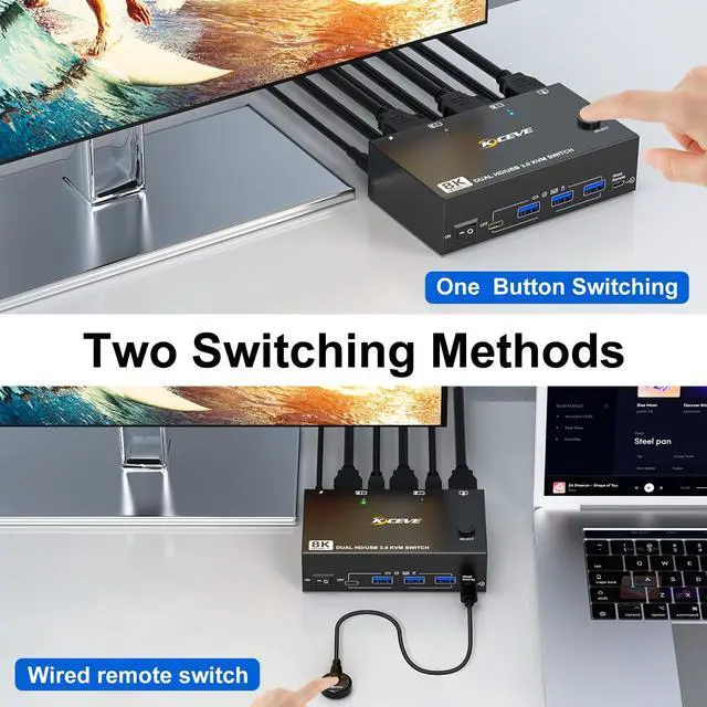 KVM Switch 2 Monitors 2 Computers This 2 Monitors KVM Switch effortlessly connect 2 PCs to share 2 monitors (supports extended & mirrored display modes) and 4 high-speed USB 3.0 ports.: Extended mode drives 2 distinct external screens; mirrored mode duplicates the same content across all 2 displays. ^^ 8K Ultra HD Dual Monitor KVM Switch HDMI 2.1 enabled 2 monitor KVM switches supports up to 8K@60Hz, 4K@144Hz & lower resolutions, delivering crystal-clear visuals with sharp, detailed imagery.
