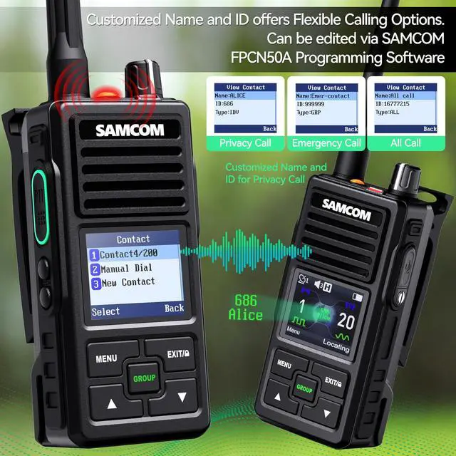 Your Needs: Personalise your channels with Customised Channel Naming and ID via software for easy identification. Program the customizable side key (SK2) for one-touch access to scan, power switch (5W High/2W Low), or VOX via SAMCOM FPCN50A software. Frequency range is UHF 406.1 -470MHz ^^ Customise full radio settings (Tx Power Level/Backlight/Brightness/Prompt Tone/Squelch Level/Vox/Timezone/Date & Time/Lone Worker) using the intuitive FPCN50A keyboard. Large colour screen delivers powerful, clear communication with excellent visibility in any condition. ^^ Easy to use with 20 pre-programmed channels (10 Digital + 10 Analog) and dual PPT buttons, the key group call function greatly provides convenience for communication among multiple work teams when broadcast simultaneously to multiple radios even if they are not set on the same channel. ^^ Essential Safety &