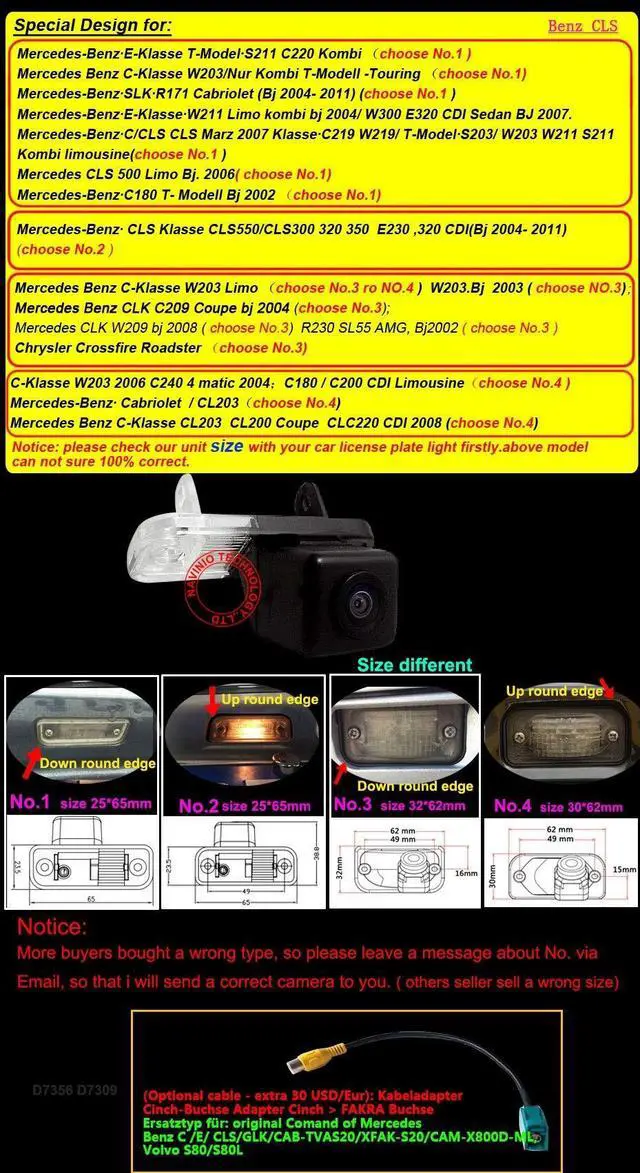 The difference in size between the two cameras: No. 1=size 25*65mm Down Round Edge No. 2=size 25*65mm Up Round Edge No. 3=size 32*62mm Down Round Edge No. 4=size 30*62mm Up round EdgeThis product could fit all of the following models as expected: Mercedes-Benz E-Klasse E-Class E320 from 2007 (choose No. 1)Mercedes-Benz E-Klasse T-model S211 Kombi (choose No. 1)Mercedes-Benz C-Klasse W203/Nur Kombi T-model-Touring (choose No. 1)Benz SLK R171 Cabriolet(Bj 2004-2011) (choose No. 1)Benz E-Klasse W211 Limo/W300 (choose No. 1)Mercedes-Benz C/CLS Klasse C219 W219/T-model S203/W203/W211/S211 Kombi Limousine (choose No. 1)Mercedes-Benz CLS Klasse CLS550/CLS300/320/350/500/E230/320CDI (Bj 2004-2011) (choose No. 2)Benz C-Klasse W203 Limo (choose No. 3)Benz C-Klasse W203 C240 4 matic 2004; W203/200 CDI Limousine (choose No. 4)Benz SL R230 Cabriolet (choose No. 4)Benz C-Klasse CL203 W203 Coupe (choose No. 4)Benz CLK W209/A209/C209 Cabrio (Bj 2004-2011) (choose No. 4)Chrysler Crossfire Roadster (choose No.