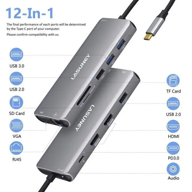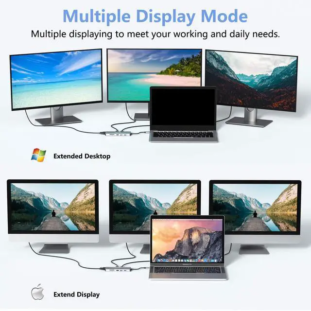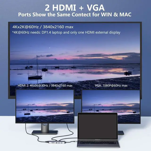 NOTE: 1. Mac OS itself does not support MST. You can only get one extended display totally with MAC, one display of HDMI1=HDMI2=VGA, one of your Macbook. 2. Please plug the original charger of your devices into the type-c PD port to ensure power. 3. Please read user manual carefully before use, and contact us if you have any questions. More specific models or systems, please confirm with us.