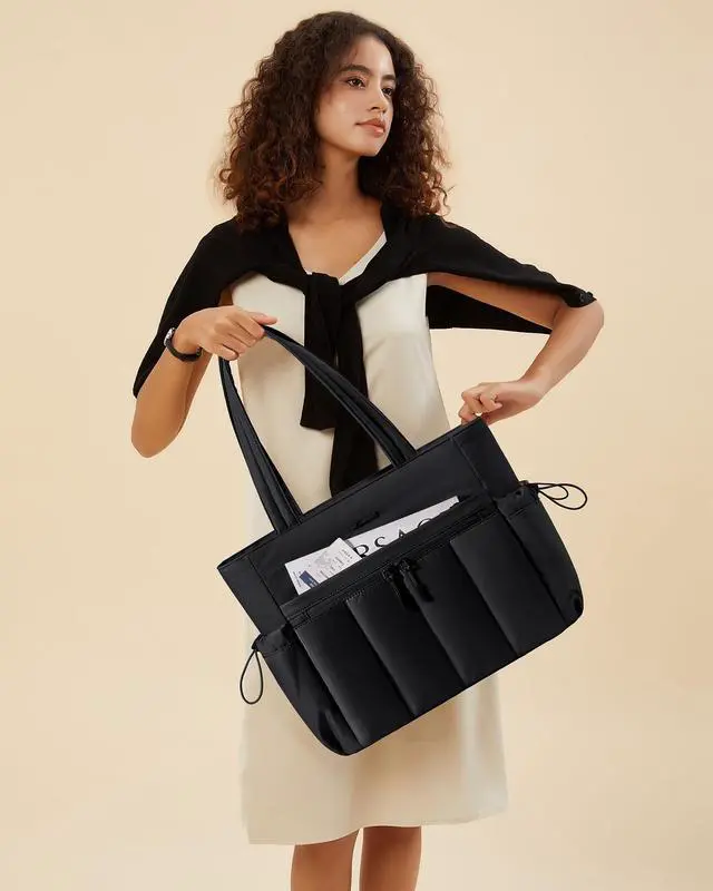 Internal Stanley Cup PocketThis tote bag for women features two bottle pockets: one specifically designed to securely store your Stanley tumbler, ensuring it stays upright and prevents tipping; the other is perfect for holding a thermos, water bottle, or umbrella. ^^ Efficient Storage with 13 PocketsThis tote offers a 23L capacity for 1-3 days trip. The front has 2 accessible zippered pockets, while the drawstring side pockets flexibly and securely fasten items. Inside, find 3 pockets, and 2 pen slots, perfect for organizing smaller necessities like keys, phones, and writing tools. ^^ Laptop Protection CompartmentKeep your electronics safe with the puffer tote bag's dedicated compartment for laptops up to 15.6 inches. The thick padded layer ensures your computer and tablets are well-protected against bumps during daily commutes or travel. ^^ Convenient Machine-Washable FabricThis work tote bag is crafted from machine-washable fabric for easy cleaning. Spend less time worrying about dirt or stains and more time focusing on your day. Confidently carry this tote bag wherever you wish to go. ^^ Lightweight & Travel-FriendlyThis puffer tote is lightweight and soft, weighing just 1.1 lbs, ensuring no additional shoulder or back strain during travel while maximizing comfort.