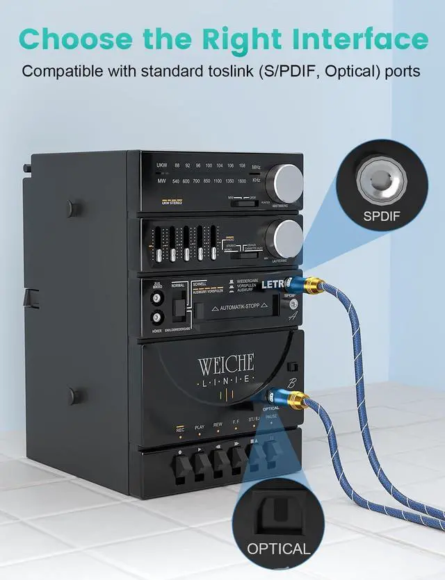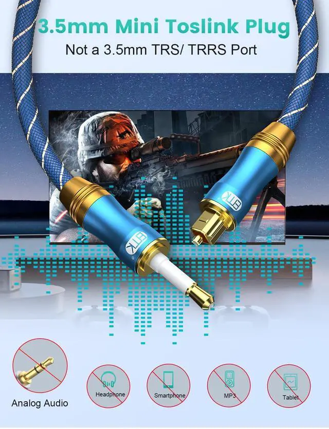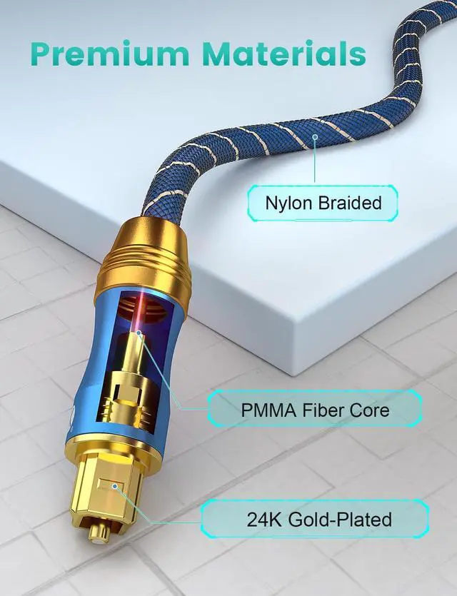 Universal CompatibilityDigital mini toslink to toslink cable is compatible with standard and high-definition devices with Toslink (Optical/S/PDIF) ports. Connect your sound bar to receiver/preamp, Audio processor, DAC, TV, gaming systems etc. ^^ Premium MaterialsDigital optical Audio cable features a durable nylon outer layer for premium quality and long usage. With an 10000+ ultra-durable bend lifespan several times longer than audio cables. You can wind it without having to worry about knots or kinks. the cable from kinks.