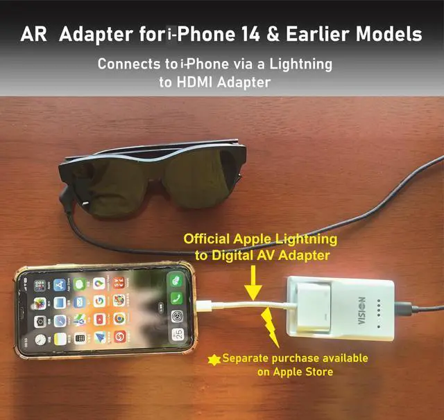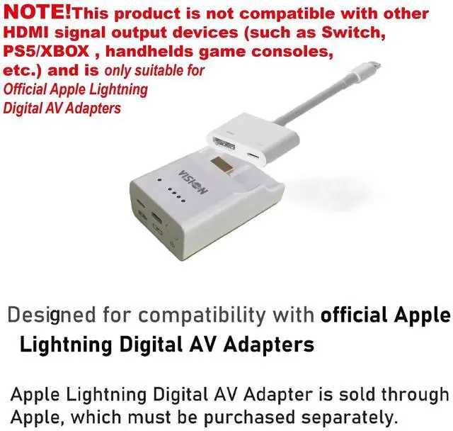 Please Note! ] This product is not compatible with other HDMI signal output devices (such as NS Switch, PS5/XBX consoles, handheld game consoles, etc. ) and is only suitable for i-Phone 14/13/12... ^^ Compatible with Apple Lightning Digital AV Adapter, enabling seamless connection for Lightning models. It is very suitable for i-Phone 14/13/12..., Lightning mobile phones. The Apple Lightning Digital AV Adapter has to be the official Apple lightning adaptor. NOT a 3rd party "certified"must purchase the REAL apple version.